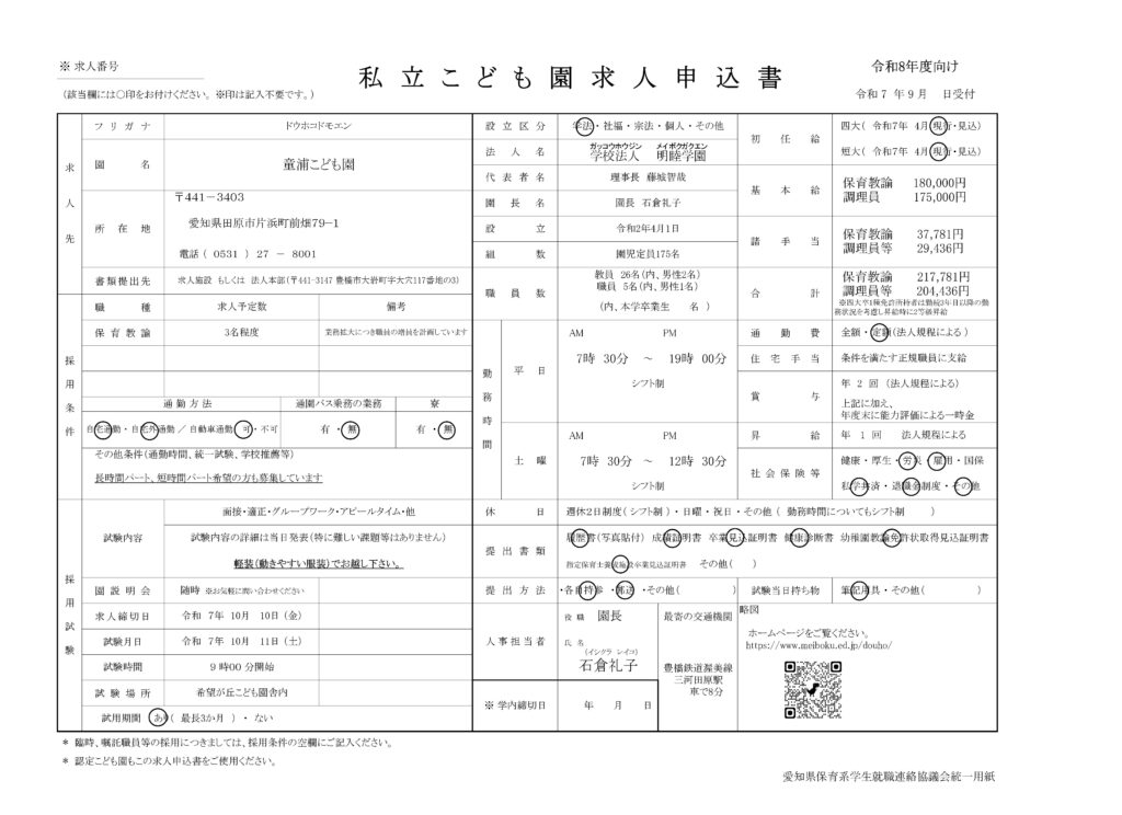 童浦こども園では年間を通して職員を募集しています