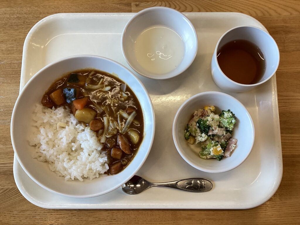 1月23日(金) お昼:カレーライス・おからサラダ・ヨーグルト おやつ:牛乳寒天 今日のカレーの具材は年中さんが考えてくれました♪ 玉ねぎ、人参、ウインナー、じゃがいも、かぼちゃ、豚肉、チーズと具たくさんです カレーはみんな大好きで、綺麗に完食していました おからサラダに使用しているおからとロースハムの組み合わせは、高タンパク、低糖質 食物繊維が豊富という栄養価の高い組み合わせで、疲労回復効果も期待できます 1月22日(木) 前の記事 1月26日(月) 次の記事