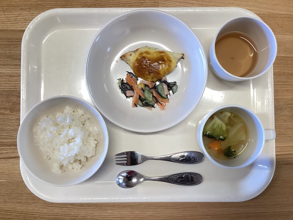 お昼:ごはん・魚のマヨカレー焼き・ひじきの洋風サラダ・コンソメスープ