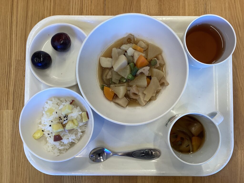 お昼:芋ごはん・秋野菜のうま煮・麩玉汁・巨峰