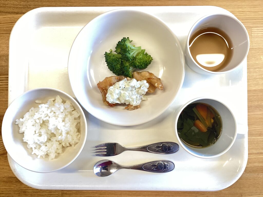 10月28日(火) お昼:ごはん・チキン南蛮・すまし汁 おやつ:かぼちゃとクリームチーズのマフィン チキン南蛮のタルタルソースは玉ねぎとパセリをマヨドレでつくった味付けになっています。 お肉とソースを一緒に食べるとおいしいと、おかわりをいっぱいしてくれました。 かぼちゃとクリームチーズのマフィンは、角切りされたかぼちゃとクリームチーズが混ぜ込み焼き上げています。 かぼちゃの甘味とクリームチーズのコクがとても合い、子ども達にも大人気でした。 10月27日(月) 前の記事