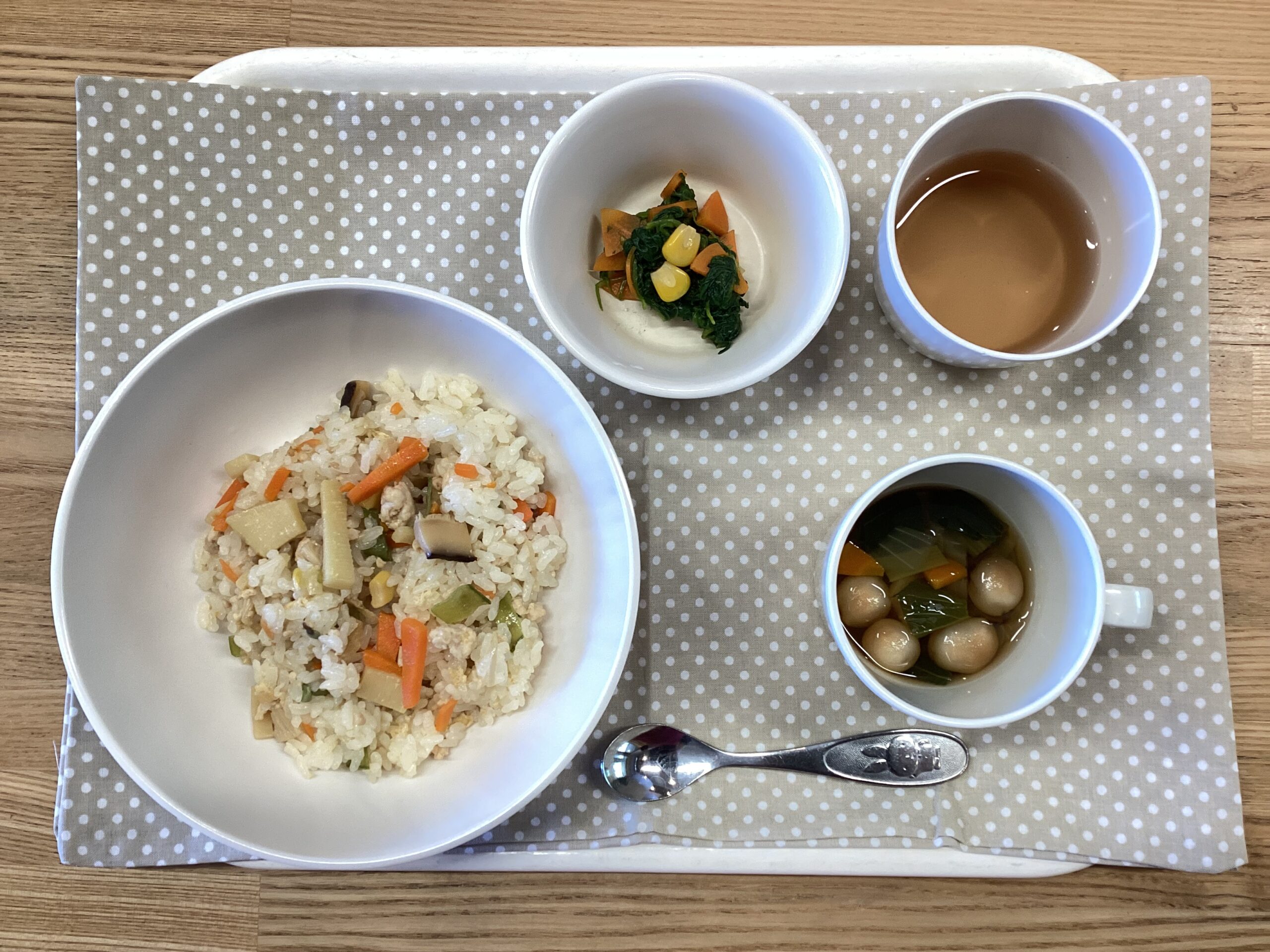 お昼:たけのこごはん・麩のすまし汁・ほうれん草の和え物
