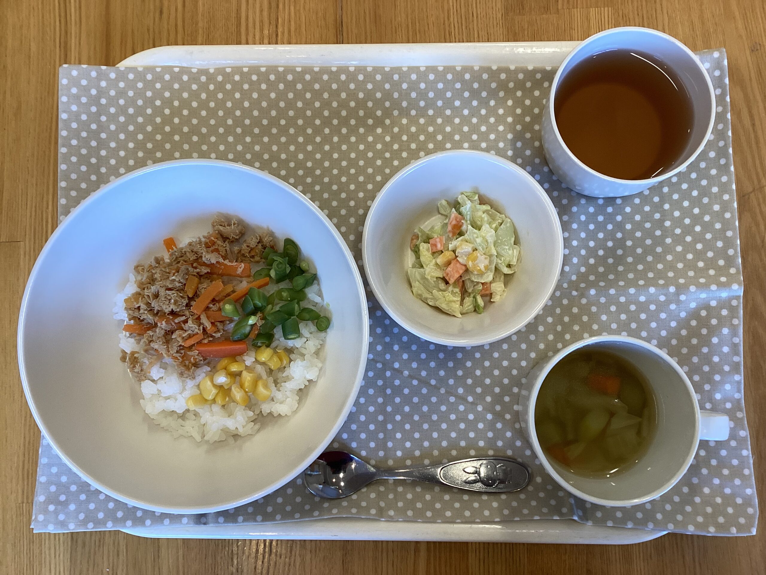 お昼:ツナそぼろ丼・キャベツサラダ・春野菜のコンソメスープ