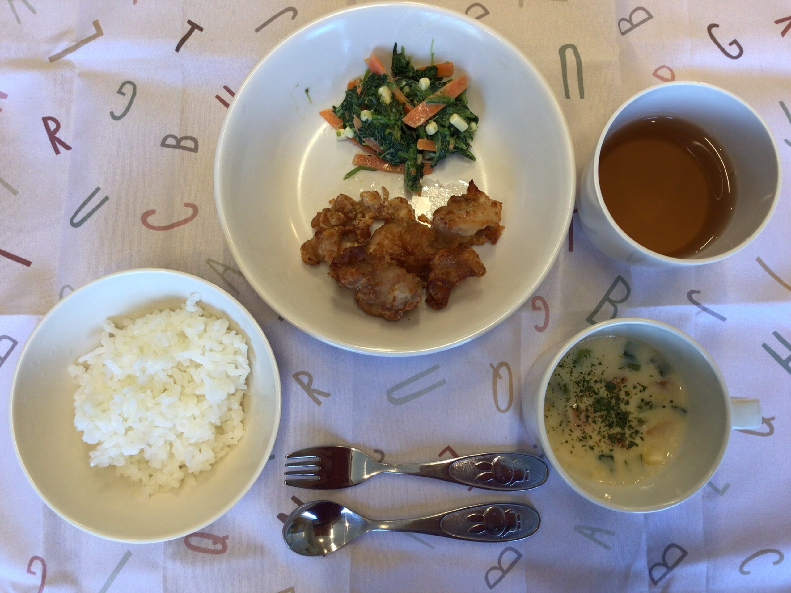 お昼:ごはん・からあげ・ほうれん草のチーズサラダ・コーンスープ