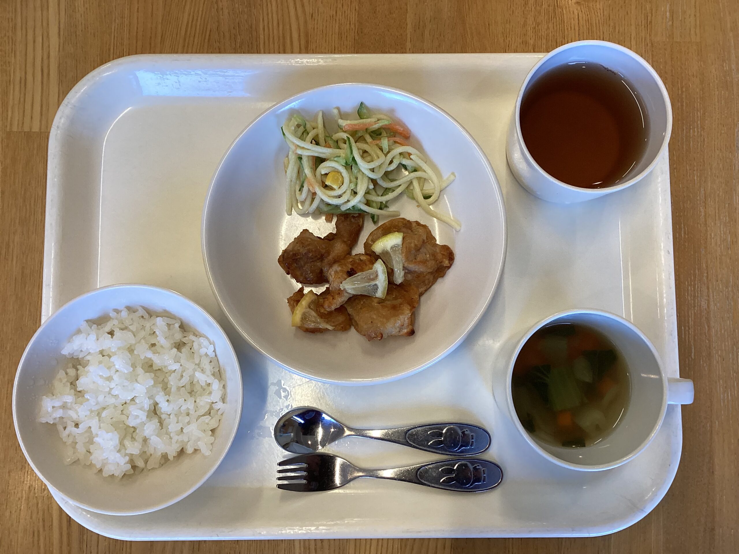 お昼:ごはん・揚げ若鶏のレモン風味・スパゲティサラダ・コンソメスープ