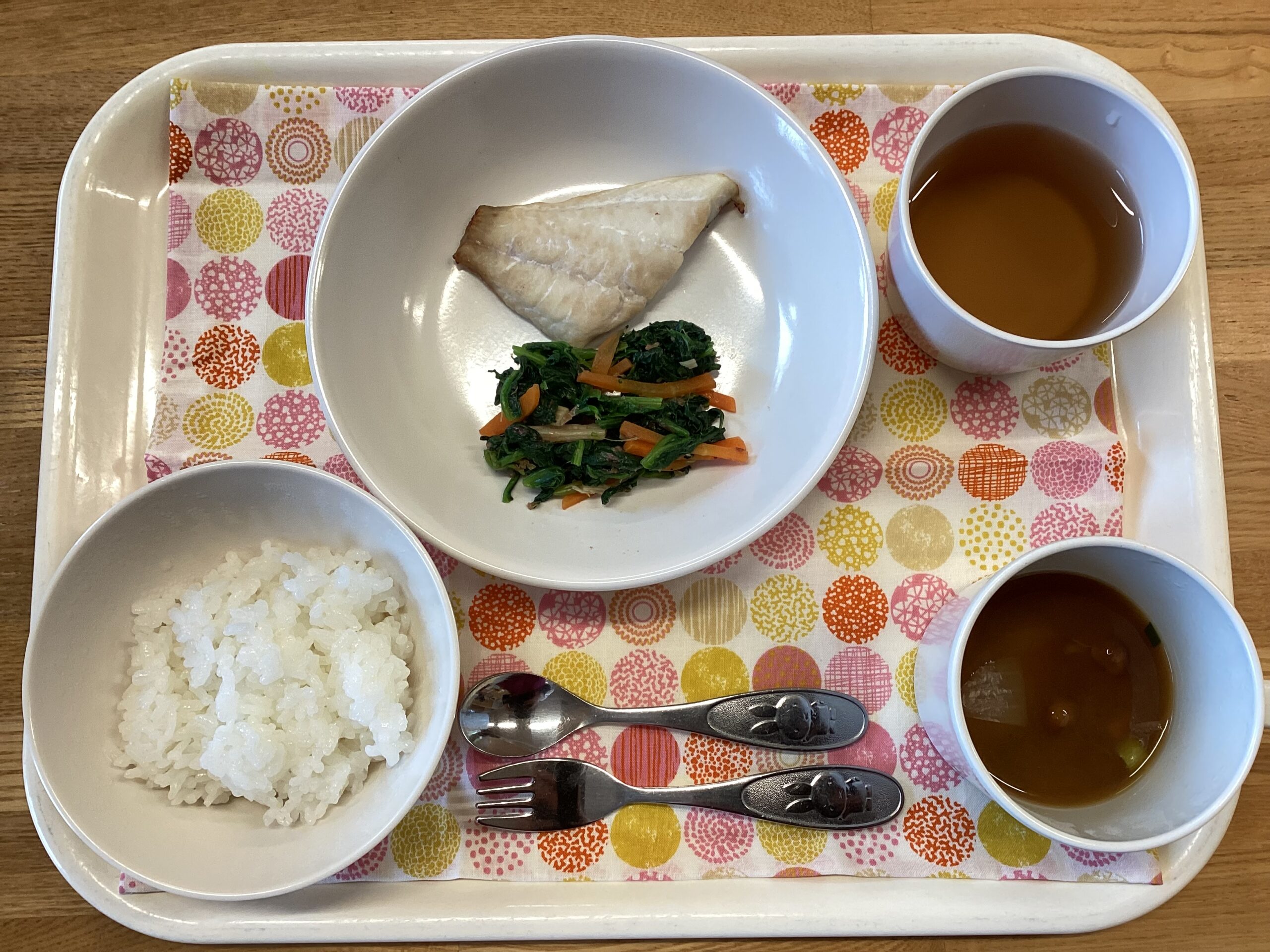 お昼:ごはん・魚の塩焼き・ほうれん草のおかか和え・みそ汁