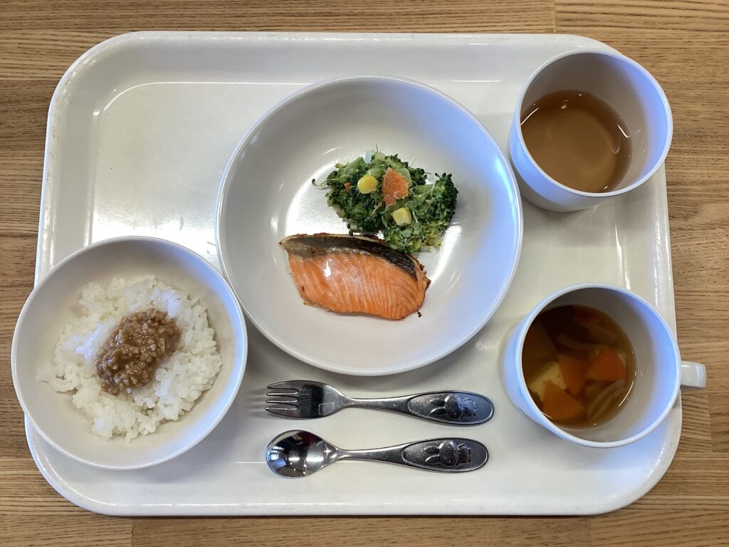2月4日(水) お昼:納豆ごはん・鮭の塩焼き・チーズサラダ・すまし汁 おやつ:牛乳寒天 今日の魚は鮭です 鮭には健康維持、疲労回復効果が期待できます 保護者の方から頂いたブロッコリーをチーズサラダに使用しています ブロッコリーには風邪予防や、抗酸化作用が期待でき、今の季節には取り入れたい食材です 2月3日(火) 前の記事 2月5日(木) 次の記事