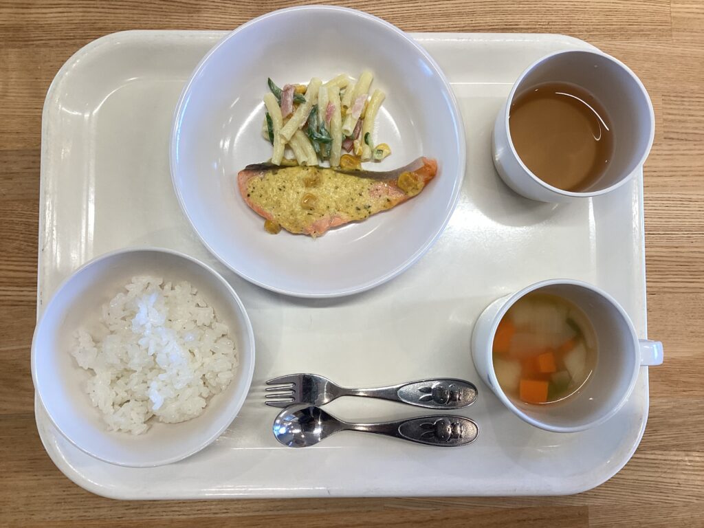 1月7日(水) お昼:ごはん・魚のクリームコーン焼き・マカロニサラダ・コンソメスープ おやつ:杏仁豆腐 今日の魚は鮭を使用しました 鮭には、免疫力向上、疲労回復などの健康効果が期待できます クリームコーンとマヨドレ、パセリを混ざ合わせた調味タレを上にのせて焼き上げました 魚が好きな子が多く、皮まできれいに食べていました♪ 1月6日(火) 前の記事 1月8日(木) 次の記事