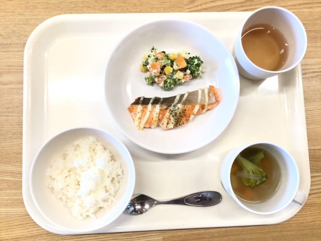 5月1日(水) お昼:ごはん・魚のマヨドレ焼き・おからサラダ・コンソメスープ おやつ:杏仁豆腐 今日の魚は鮭が届きました。マヨドレ焼きとの相性も良く、子ども達の食べもとてもよかったです。 おからサラダのおからは、スチームコンベクションで乾煎りし、蒸した野菜と和え、マヨドレで味付けをしています。乾煎りの一手間を加えることで、子どもでも食べやすい口触りになり、野菜が苦手な子でも食べやすいサラダになっています。 4月30日(火) 前の記事 5月2日(木) 次の記事