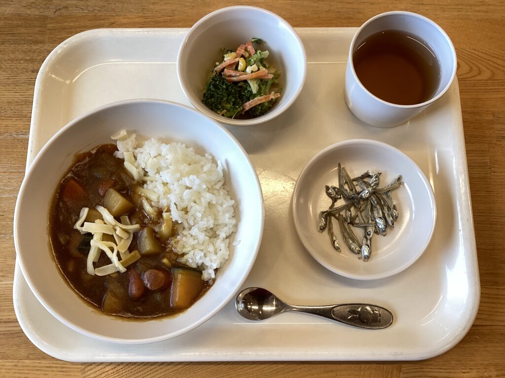 お昼:カレーライス・チーズサラダ・干しいわし