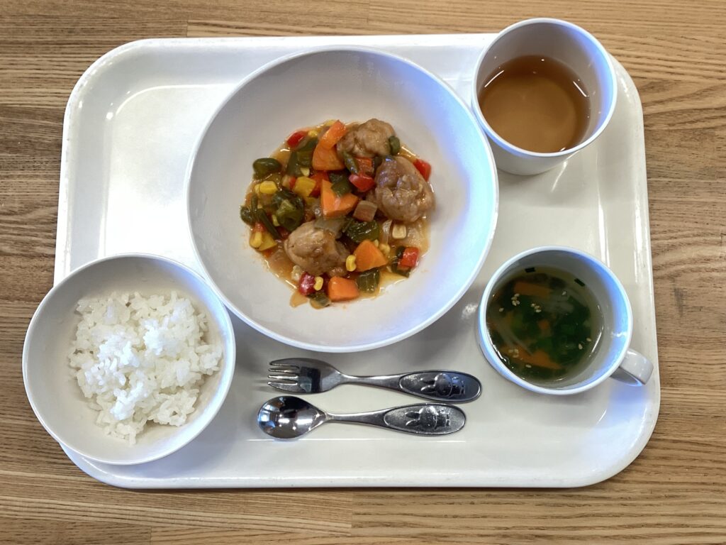 11月20日(木) お昼:ごはん・酢豚・春雨スープ おやつ:蒸しパン 今日の酢豚はピーマン、赤パプリカ、黄パプリカなど使用しているので、彩りも良いです 豚肉にはビタミンB1による疲労回復効果があるので、急な気温変化で体が疲れやすいこの時季には取り入れたい食材です 春雨スープの春雨は、緑豆から作られているものを使用しています 11月19日(水) 前の記事 11月21日(金) 次の記事