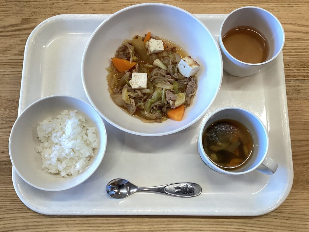 11月21日(金) お昼:ごはん・すき焼き風・すまし汁 おやつ:牛乳寒天 今日はすき焼き風です 野菜や肉、豆腐など複数の食材から、栄養をバランスよく摂取できる一品です すまし汁も具材を豊富に使用していて、その中になめこも入っています なめこは腸内環境を整える効果が期待できます 11月20日(木) 前の記事 11月25日(火) 次の記事