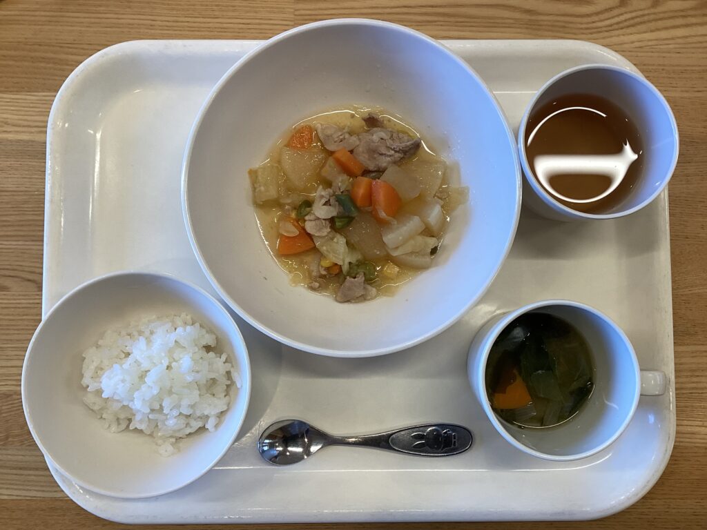 12月8日(月) お昼:ごはん・豚大根・みそ汁 おやつ:ミルクもち 豚大根は、豚肉の疲労回復効果(ビタミンB1)と大根の消化促進・免疫力向上 (ジアスターゼ、ビタミンⅭ、食物繊維)の栄養が合わさり、免疫力アップ、胃腸の調子を 整える、風邪予防に役立つバランスの良い組合わせです 豚肉のたんぱく質と大根のビタミン・食物繊維が互いの良さを引き出し、寒い季節に嬉しい 栄養満点の一品です♪ みそ汁には、保護者の方から頂いた白菜を使用しています 12月5日(金) 前の記事 12月9日(火) 次の記事