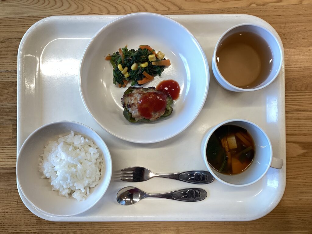 10月16日(木) お昼:ごはん・ピーマンの肉詰め・ほうれん草のおかか和え・みそ汁 おやつ:チーズ蒸しパン ピーマンには、ビタミンC、β‐カロテン、カリウム、食物繊維、ビタミンEが豊富に含まれており 免疫力向上などの健康効果が期待できます 切り方で苦みや食感が変わるので、苦いのが苦手な子には繊維に沿って縦方向に切ると、苦味が軽減されます 今日は縦半分に切ったピーマンに作った肉種を詰めているので、肉のうま味がピーマンに移って 苦味をあまり感じることなく食べられます 10月15日(水) 前の記事
