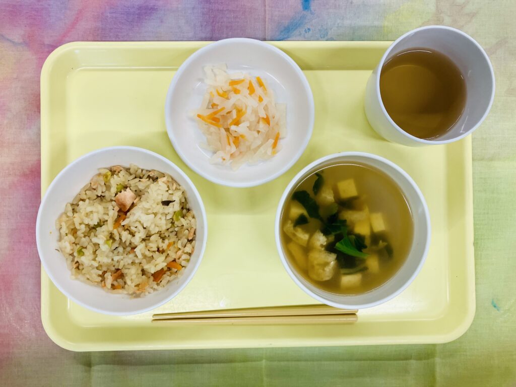 今日は鮭とたっぷりのきのこが入った混ぜご飯です。人参、枝豆も入って、彩りよく秋らしい一品になりました。子どもたちもたくさんおかわりをしてくれたようです。
