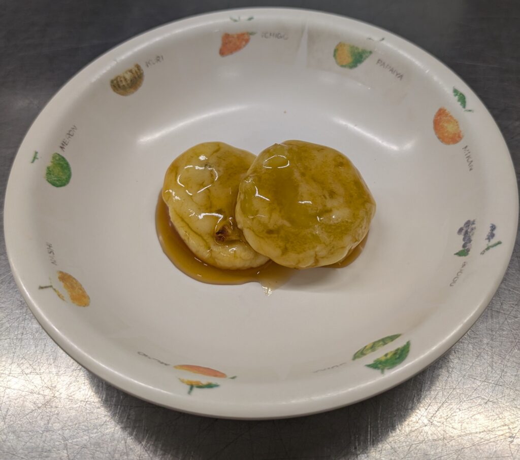 園では乳児さんたちでも食べれるように、団子ではなく、さつまいものおやきに、みたらし団子のタレをからめて作りました。