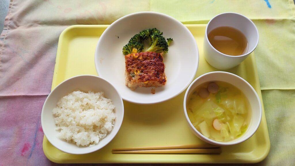 ごはん コンソメスープ ミートローフ 茹でブロッコリー