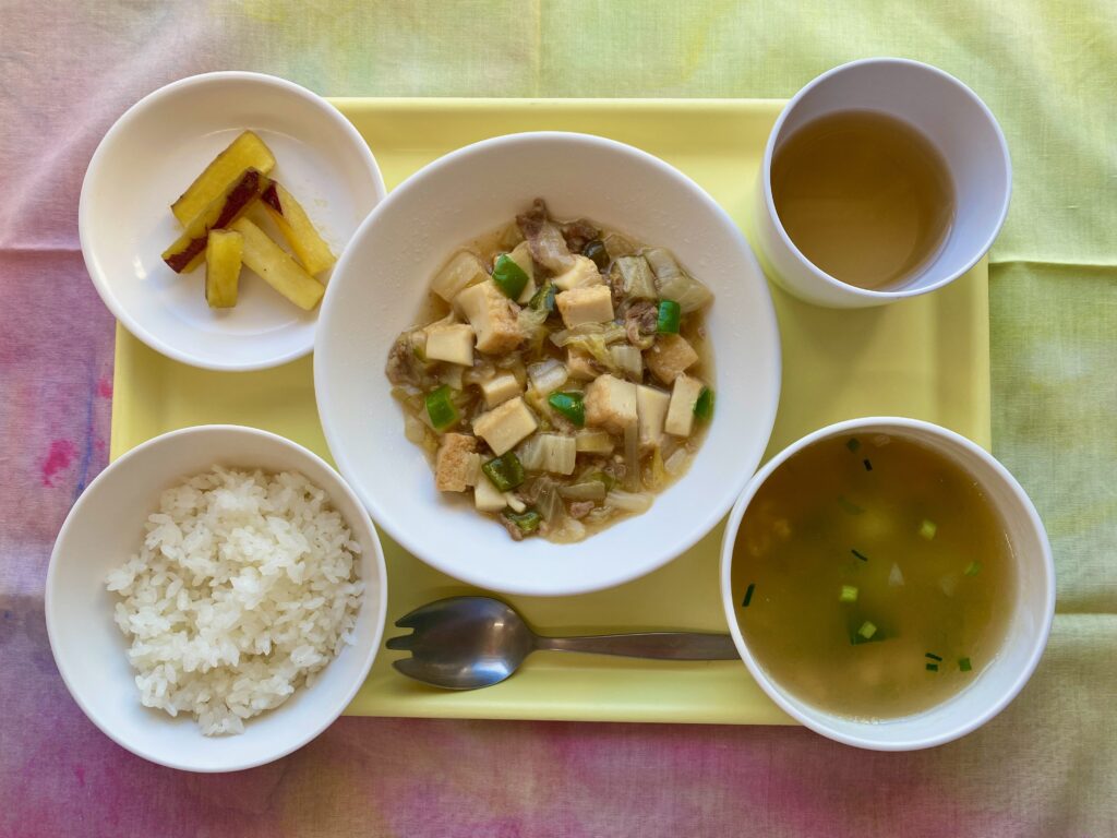 ご飯 青菜の中華スープ 厚揚げの中華煮 さつま芋スティック揚げ