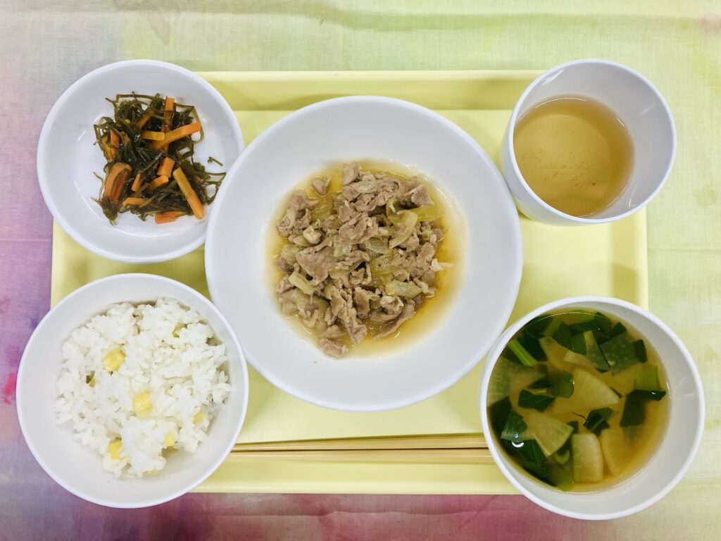 今日はさつまいもご飯です。園で採れたさつまいもを使用しています。秋が旬のさつまいもはビタミン、ミネラル、食物繊維などが豊富で、免疫力向上や腸内環境の改善に効果がみられます。さつまいもご飯は子どもたちの好きなメニューの一つです。ご家庭でも、ぜひ作ってみてください。