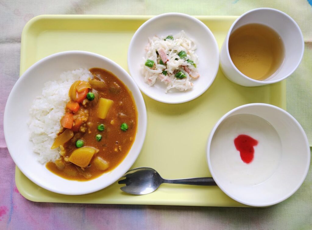 今日は、カレーライスです。じゃがいもはキタアカリを使用しました。キタアカリは、煮崩れしやすいためご家庭ではレンジで一度加熱してから冷ますと、細胞が締まり煮崩れしにくくなります。園では、しっかり蒸してから最後に入れ煮崩れしないように仕上げました。