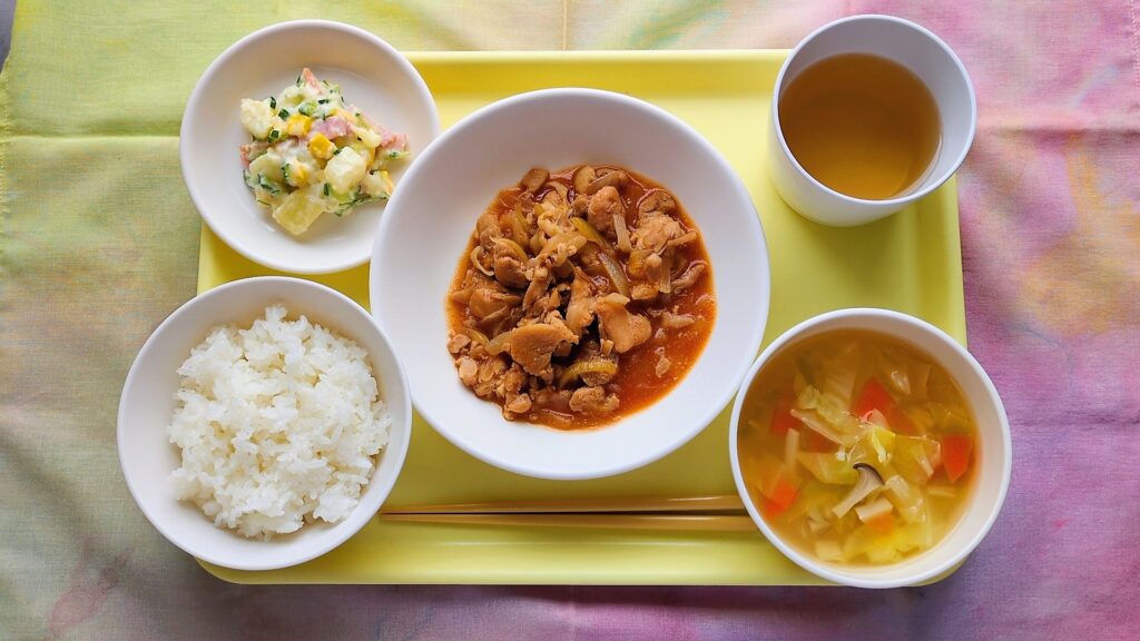 ごはん 野菜スープ チキンチャップ ポテトサラダ