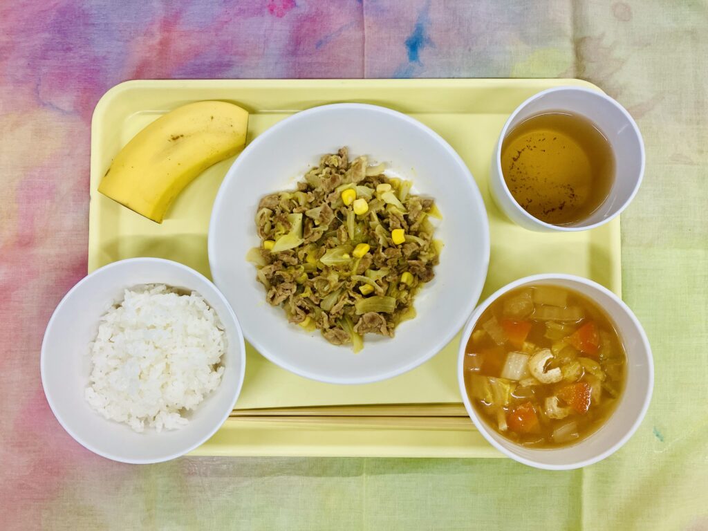 今日のメニュー 1月20日(火) ごはん 野菜のみそ汁 豚肉のカレー炒め バナナ カレー炒めは子どもたちが食べやすいように、カレー粉は控えめに味付けしてあります。キャベツや玉ねぎの甘さとカレーの風味で、食欲をそそる一品になりました。カレーの匂いが、給食室の外にも香ったのか、いつもより給食室をのぞく子どもたちがたくさんいたように思います。 今日のメニュー 前の記事 今日のメニュー 次の記事