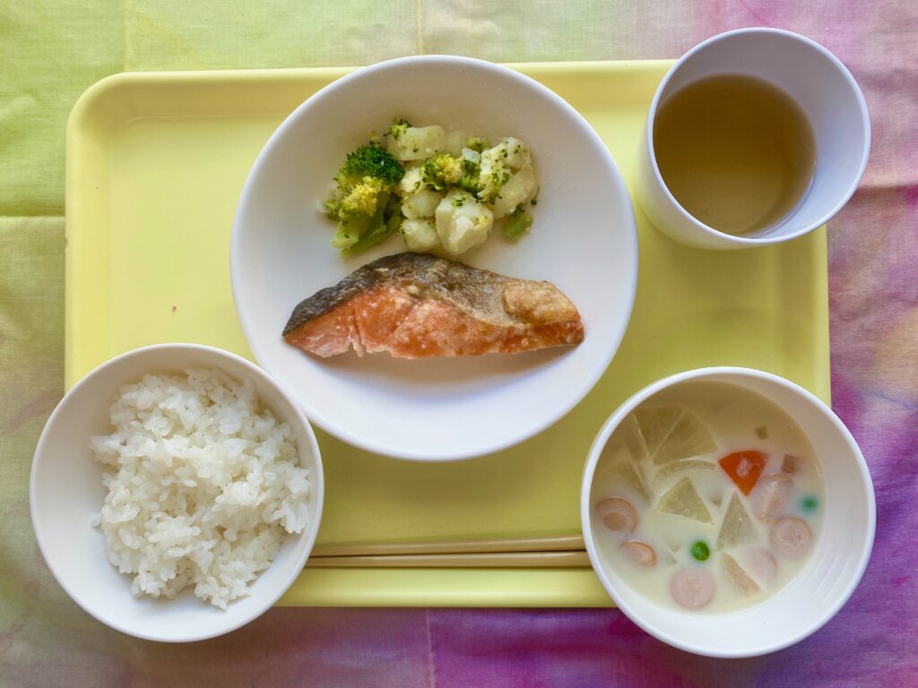 ごはん 豆乳スープ 魚のムニエル ブロッコリーとポテトの炒め物