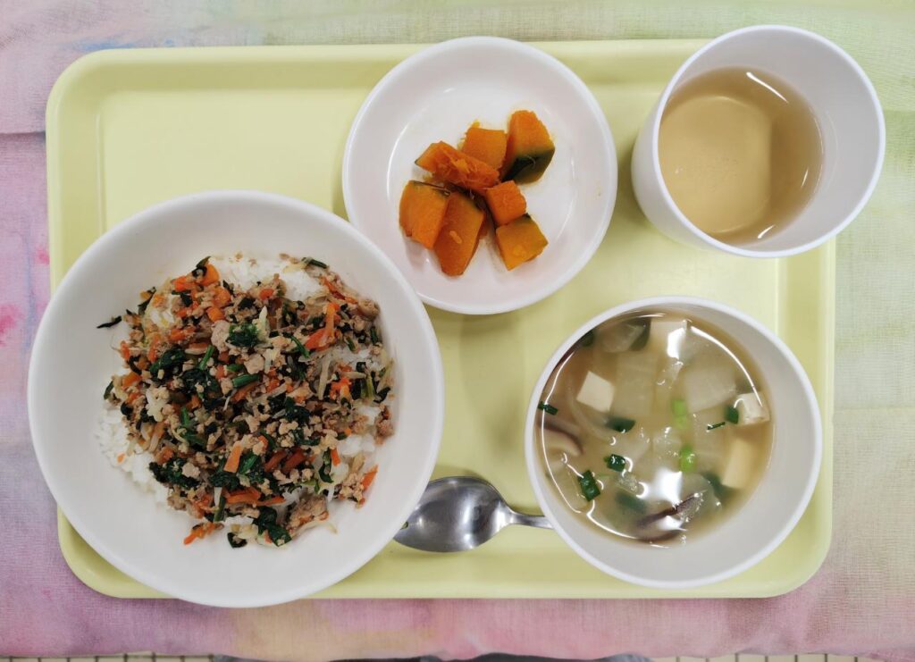 今日のメニュー 2月17日(火) キッズビビンバ 玉ねぎの中華スープ かぼちゃの甘煮 今日は、キッズビビンバです。生姜の風味、ごま油の香りが野菜とマッチするビビンバになりました。3歳児クラスの先生からは「おかわりがあっという間になくなりました。」とよく食べてくれたようです。ご家庭では、その日の分だけではなく少し多めに作り冷凍しておくと時短調理もできるのでお試し下さいね。少し苦手な野菜も入れて試すのもいいですね。 今日のメニュー 前の記事 今日のメニュー 次の記事