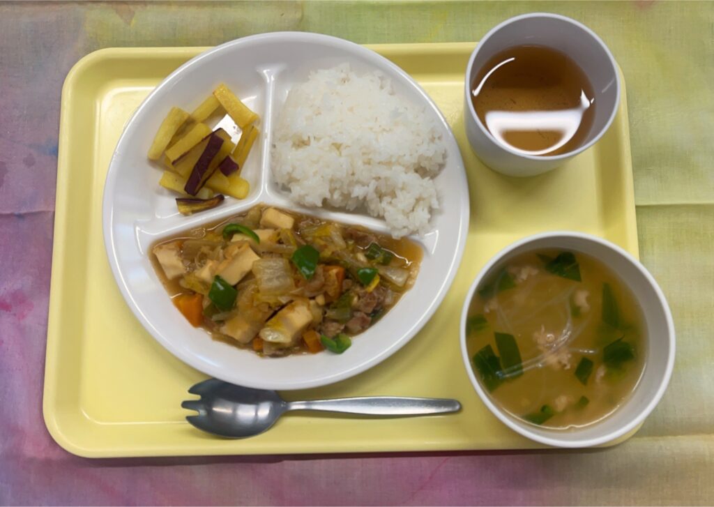 ごはん 青菜の中華スープ 厚揚げの中華煮 さつま芋スティック揚げ