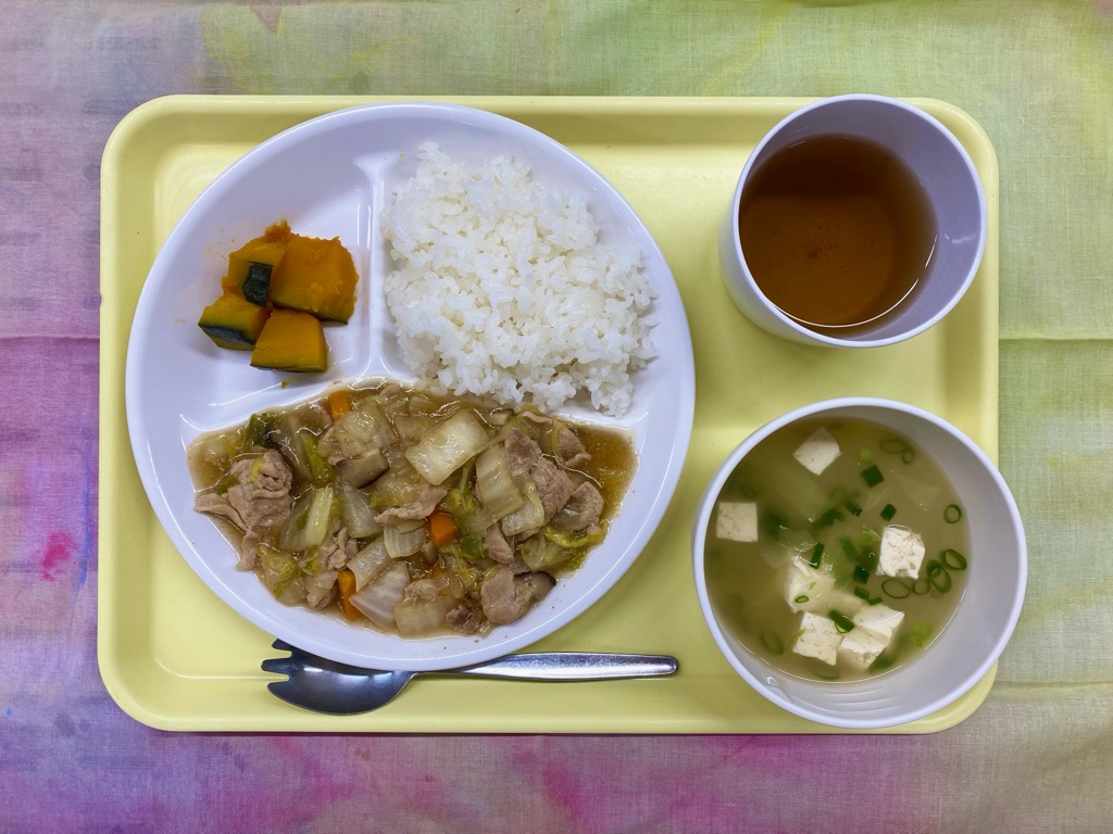 今日のメニュー 4月1日(水) ごはん 中華スープ 八宝菜 かぼちゃの煮物 今日は八宝菜です。 白菜・玉ねぎ・人参・しいたけを豚肉と一緒に炒めました。たっぷりの白菜から出た水分だけで作ったので、栄養を逃さずに、お肉と野菜の旨味が効いた八宝菜です。 かぼちゃの煮物はしっとりとしてとても柔らかく、甘さが引き立って、おいしい煮物に仕上がりました。 今日のメニュー 前の記事 今日のメニュー 次の記事