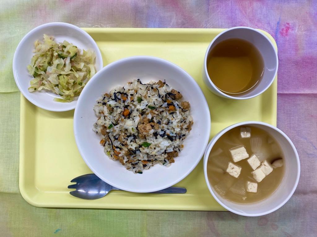 今日のメニュー 4月8日(水) ひじきチャーハン だいこんの中華スープ キャベツとツナの酢和え 今日はひじきチャーハンです。 鶏ひき肉・ひじき・にんじん・ねぎをごま油で炒め、ご飯に混ぜ込みました。 鶏ひき肉の旨みとコク、ごま油の香りが食欲をそそる、子どもたちに人気のメニューです。 鉄分やカルシウムなどが豊富に含まれており、手軽に栄養を摂取できます。 今日のメニュー 前の記事 今日のメニュー 次の記事