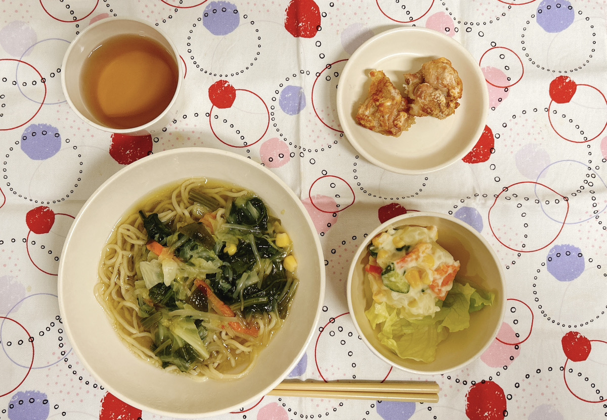 もやし、ほうれん草、キャベツ、人参など野菜がたっぷり入っています。