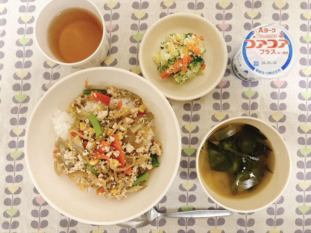 肉とごぼうの混ぜごはん    おからサラダ    みそ汁    コアコアプラス