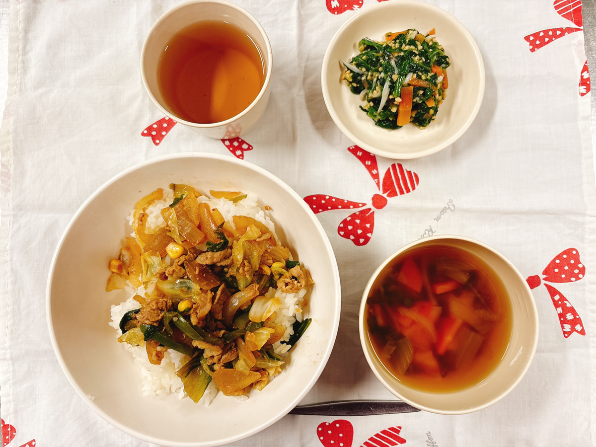 明日のみそ丼には、豚肉の他にキャベツ、チンゲン菜、玉ねぎ、ピーマン、コーン缶が入ります。
