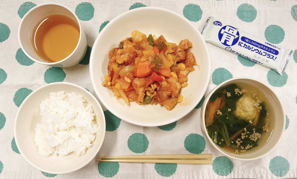 ごはん  酢豚  肉団子春雨スープ  ウエハース