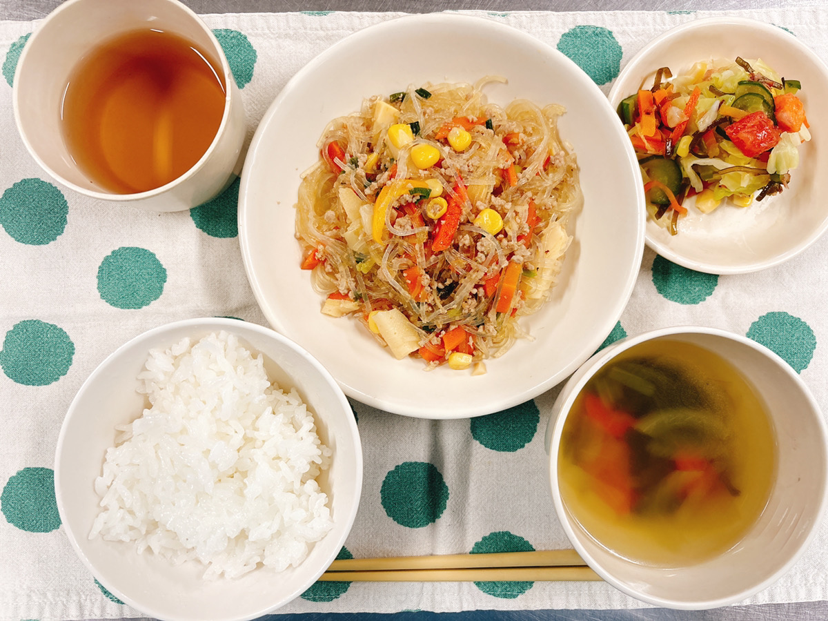 ごはん  春雨のそぼろ炒め  りっちゃんのサラダ  中華スープ