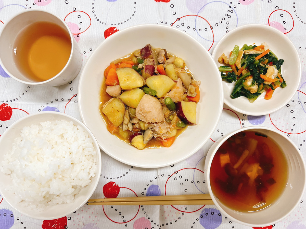 ごはん さつまいもと鶏肉の甘辛炒め なめこのすまし汁 小松菜と油揚げの胡麻酢和え