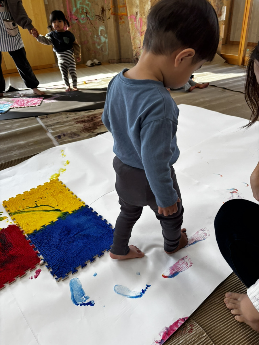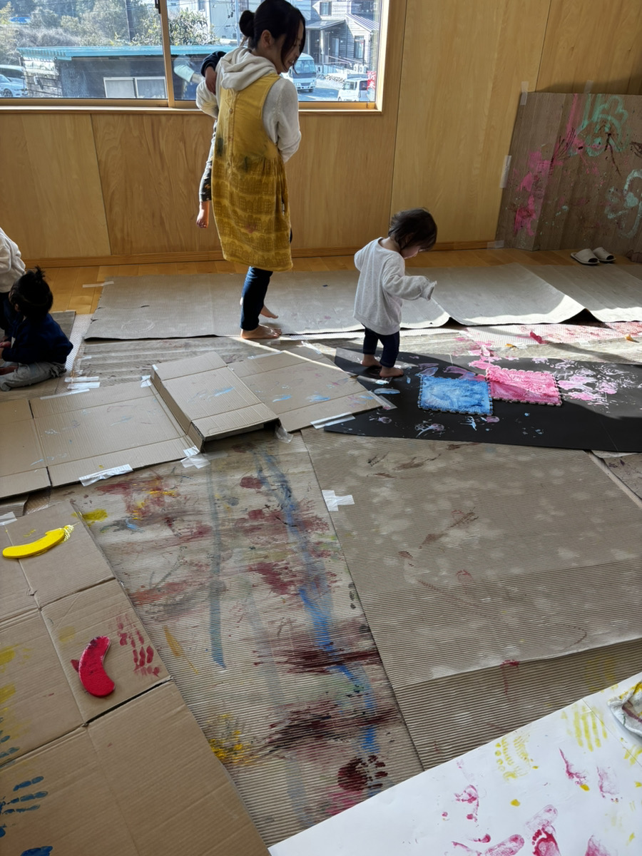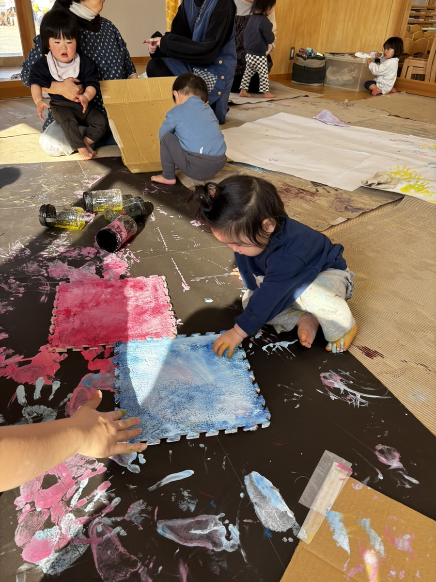 1月16日(金) 0歳児絵の具あそび 四角いカーペットに染み込んだヌルッとした絵の具を足の裏で感じたり手で触ってみたり綺麗な色水の入った入れ物を光にかざしたり転がしたり積み上げたりして遊びました。 1月16日(金) 今日の給食 前の記事 1月16日(金) 1歳児土粘土あそび 次の記事