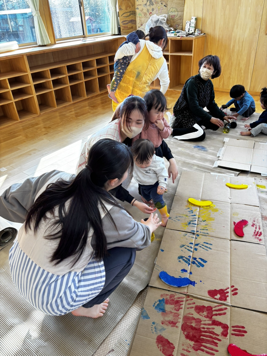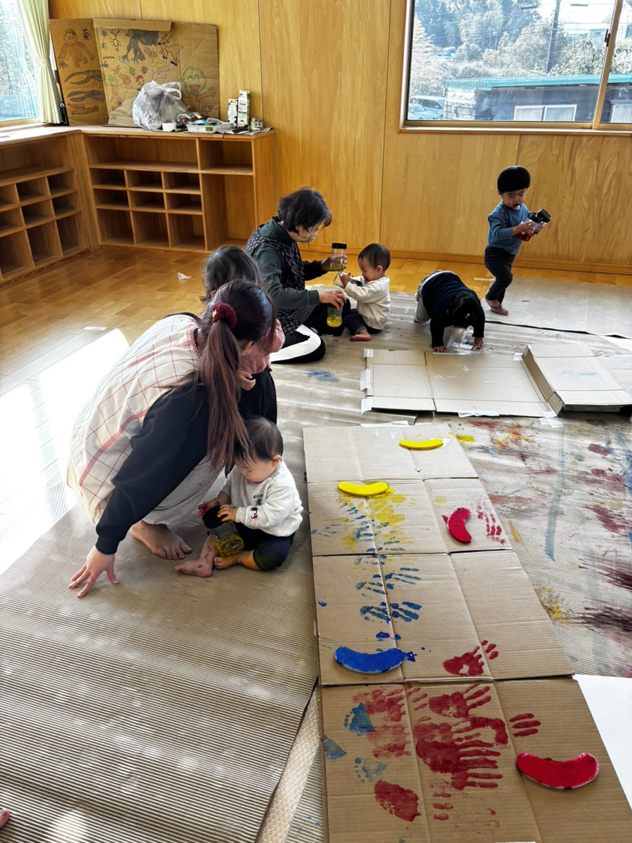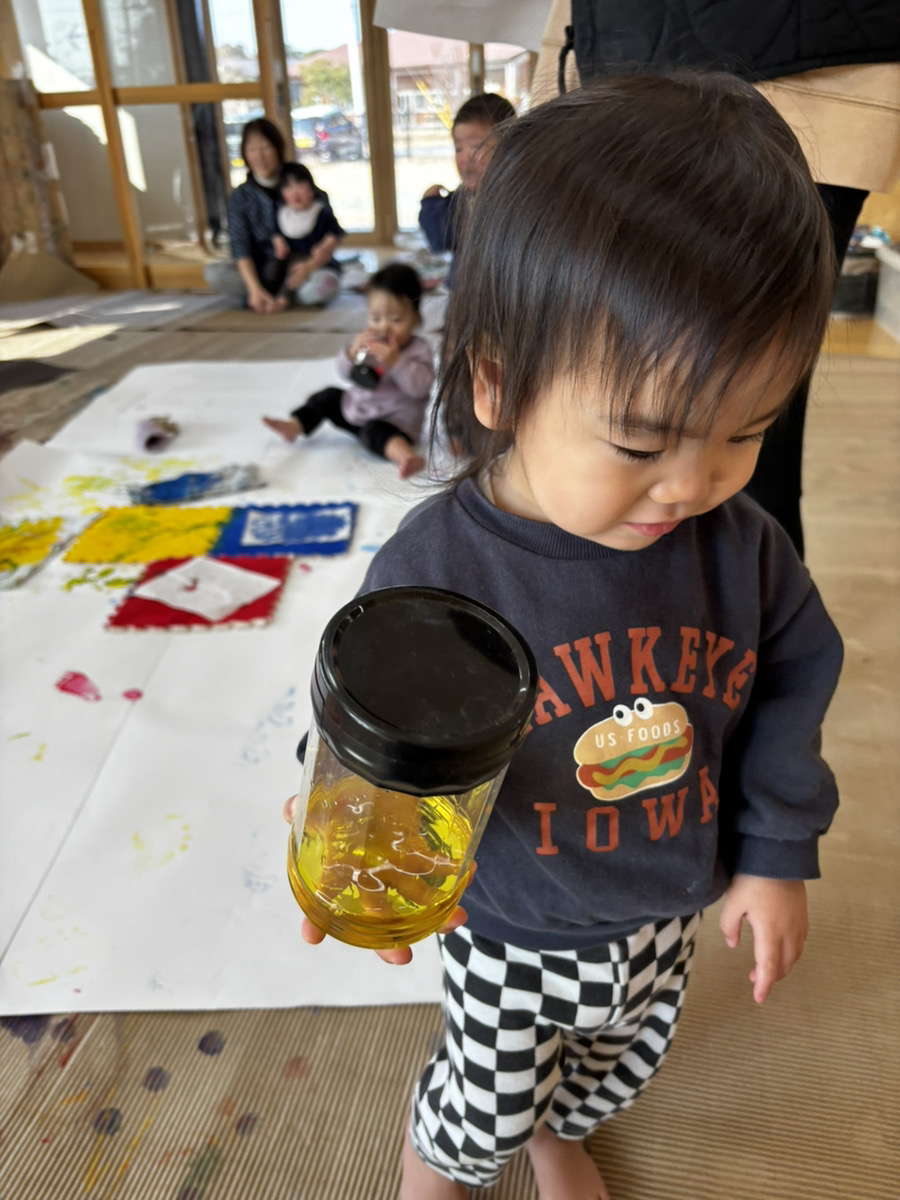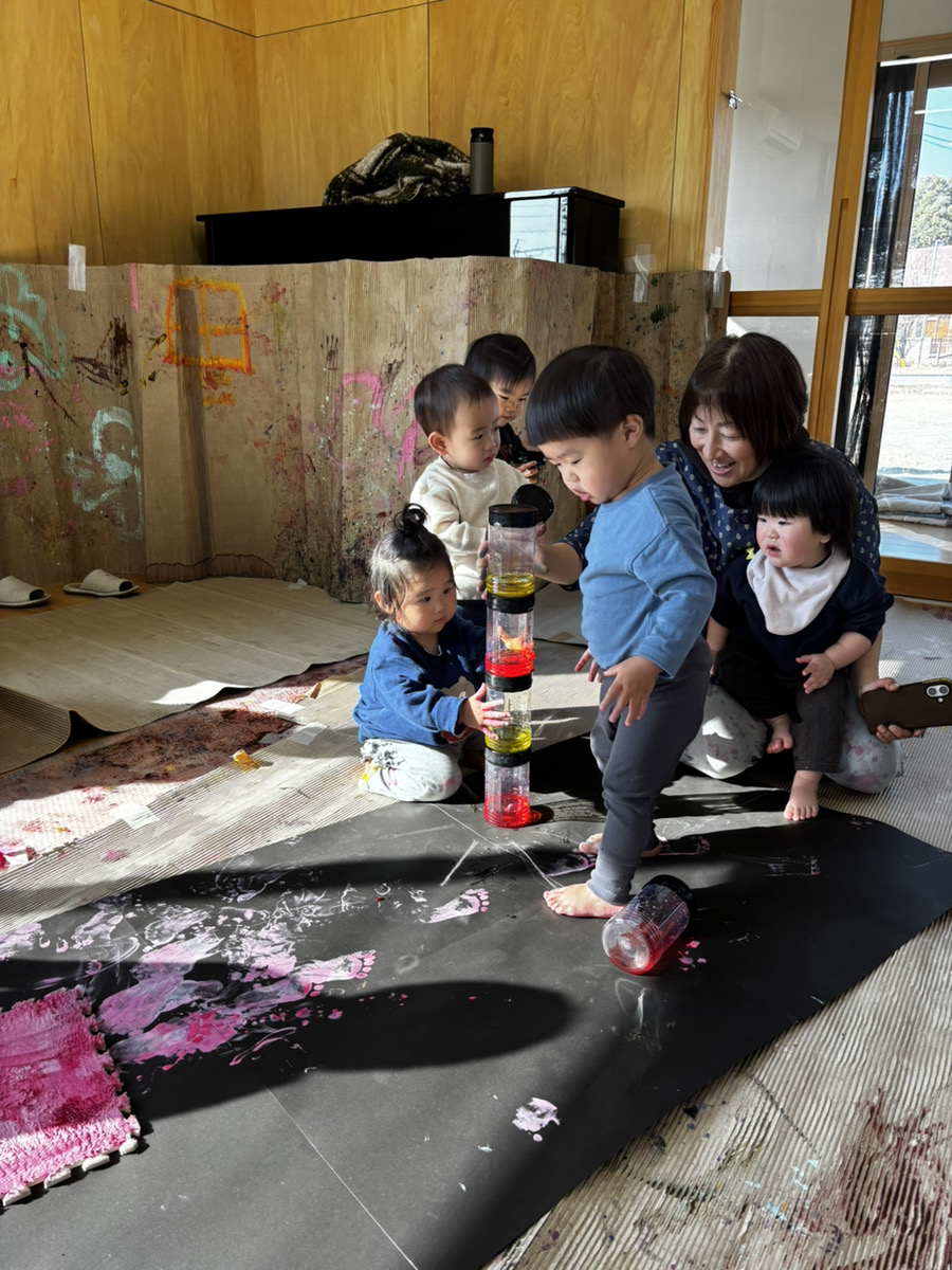 1月16日(金) 0歳児絵の具あそび 四角いカーペットに染み込んだヌルッとした絵の具を足の裏で感じたり手で触ってみたり綺麗な色水の入った入れ物を光にかざしたり転がしたり積み上げたりして遊びました。 1月16日(金) 今日の給食 前の記事 1月16日(金) 1歳児土粘土あそび 次の記事