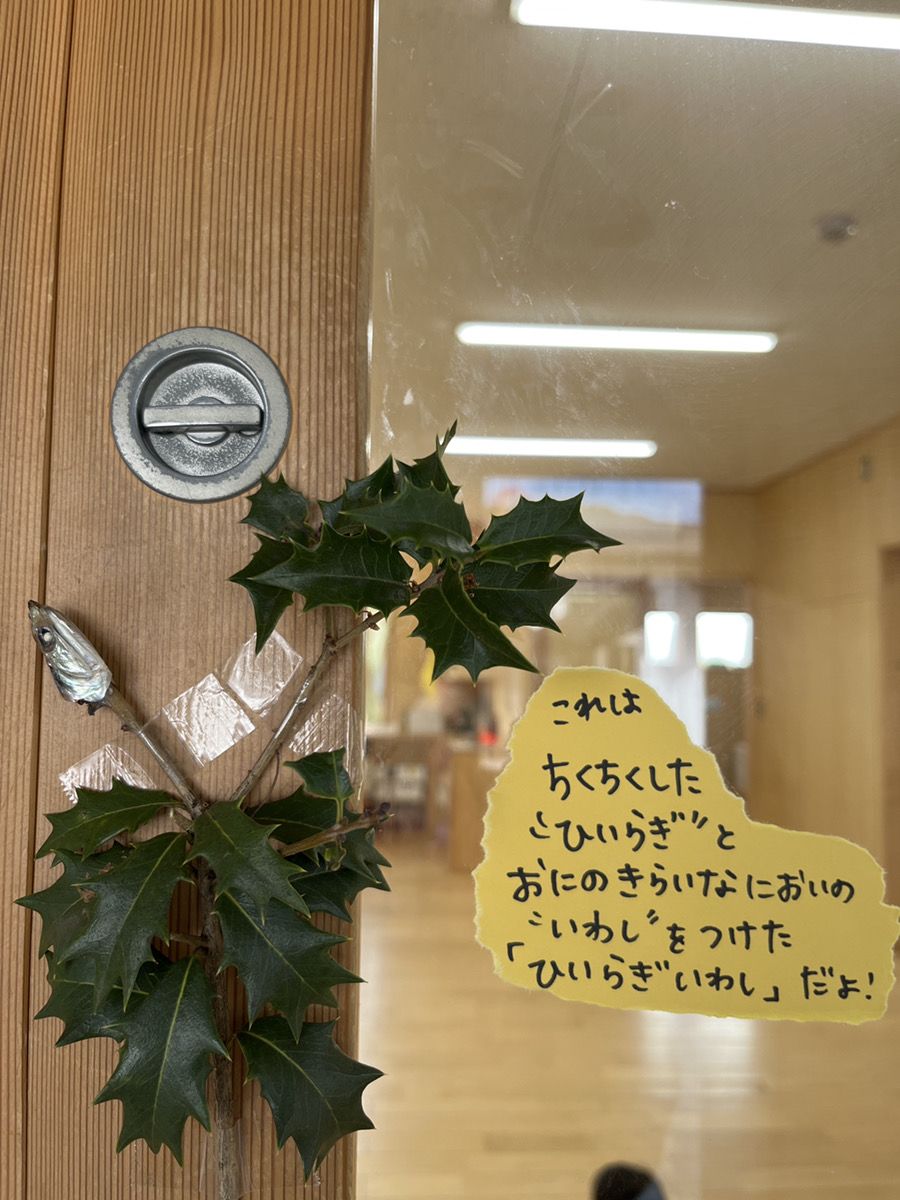 柊鰯(ひいらぎいわし)は、節分に鬼(邪気)を追い払うために玄関先へ飾る、柊(ひいらぎ)の枝に焼いた鰯(いわし)の頭を刺した魔除け・厄除けの風習です。尖った柊の葉で鬼の目を刺し、鰯の臭いで鬼を遠ざけるという意味があり、2月3日を中心に飾られます。