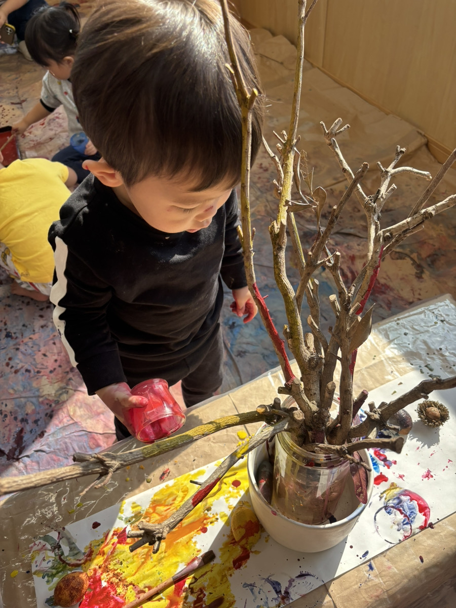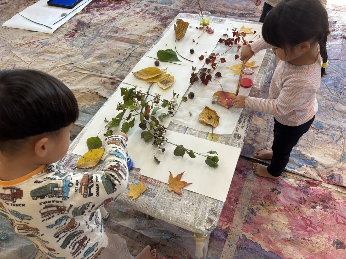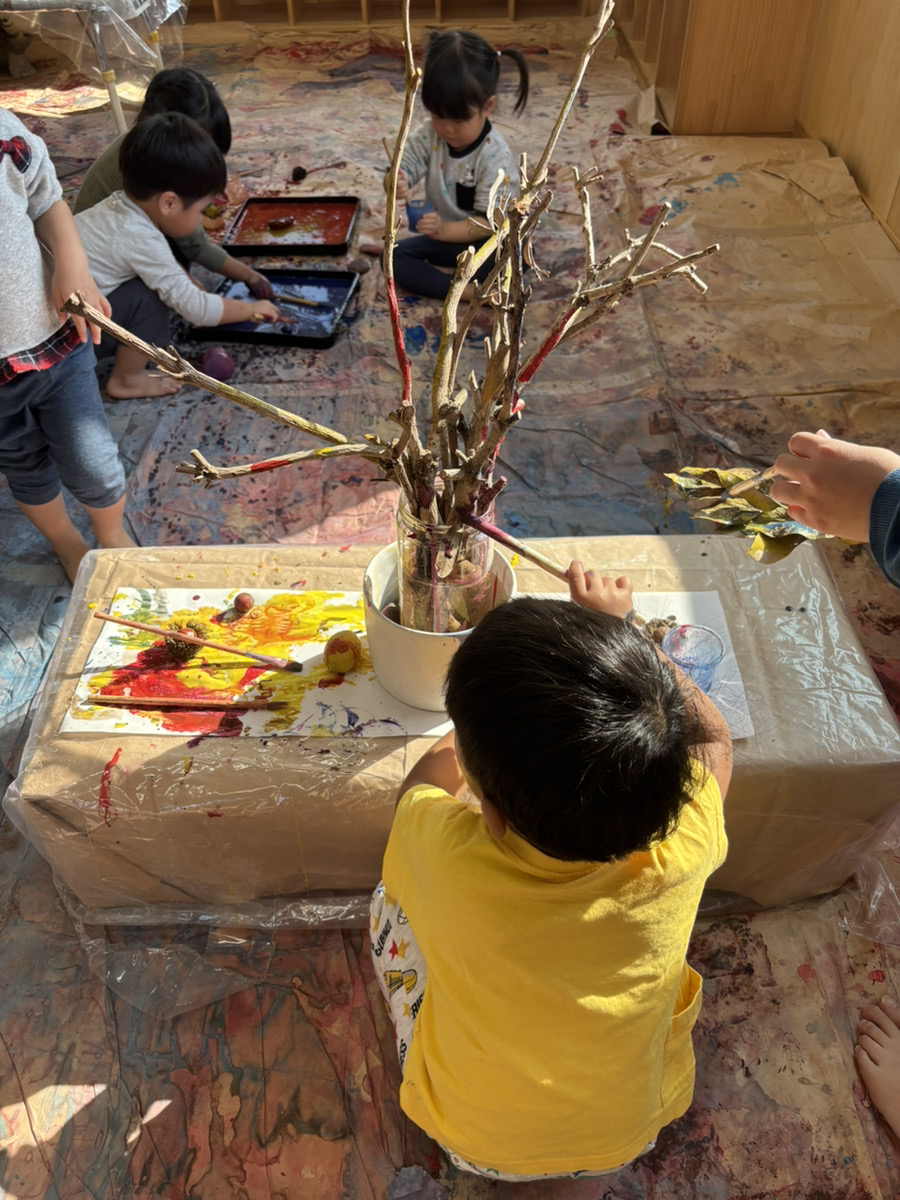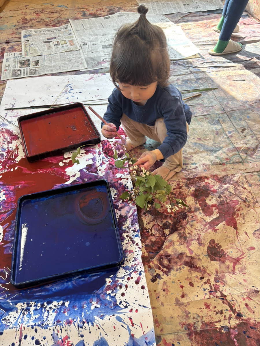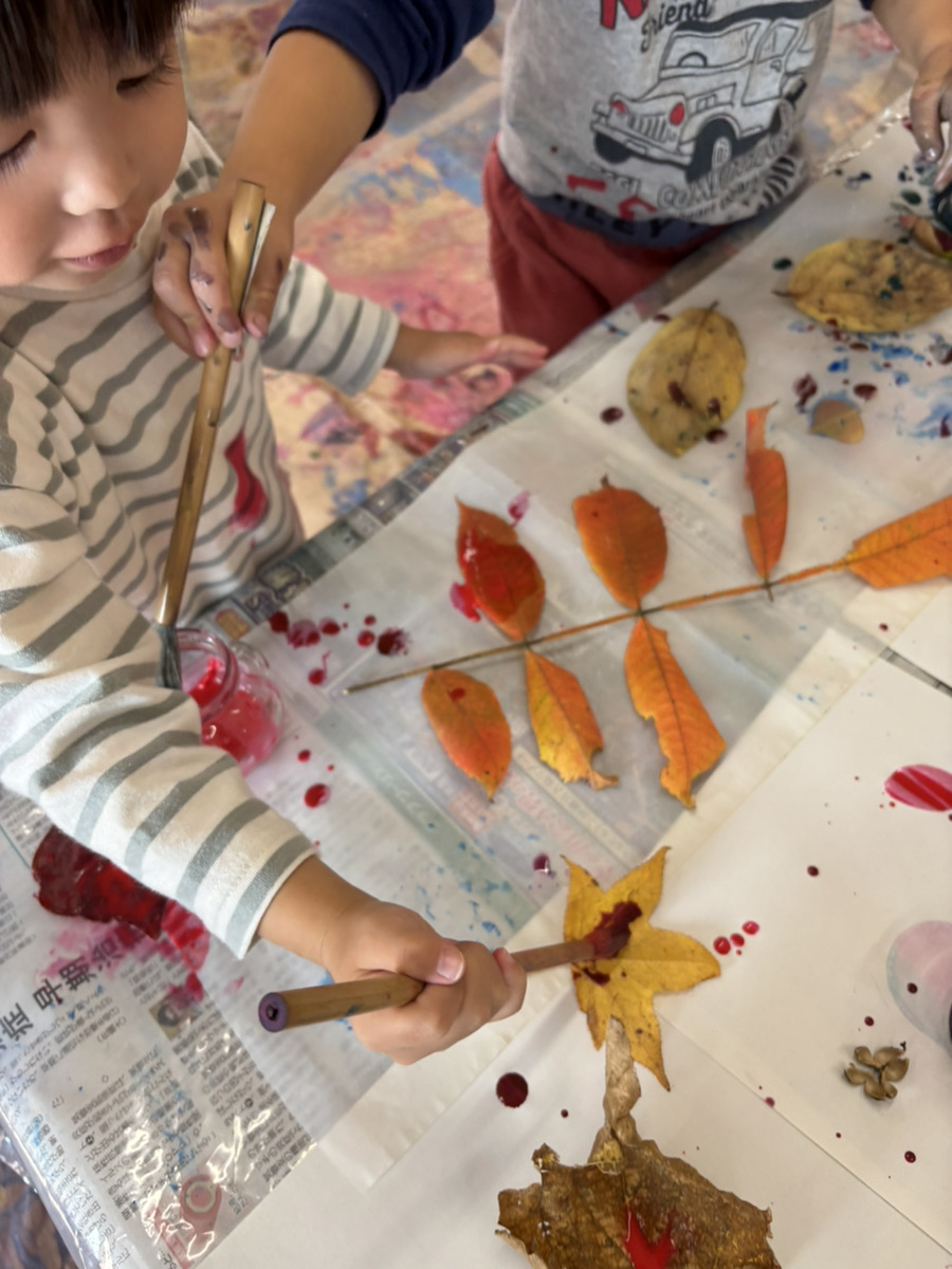子どもたちは目をキラキラさせながら(躊躇せず!)目の前の季節の自然物を手に取り、絵の具をつかって遊び始めました。熱気のある、でもすごく静かな時間が流れていました。