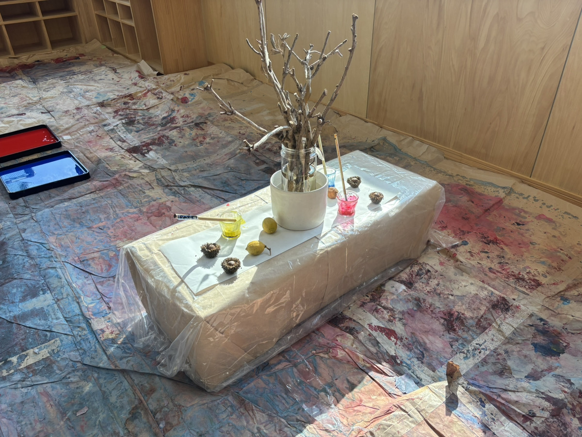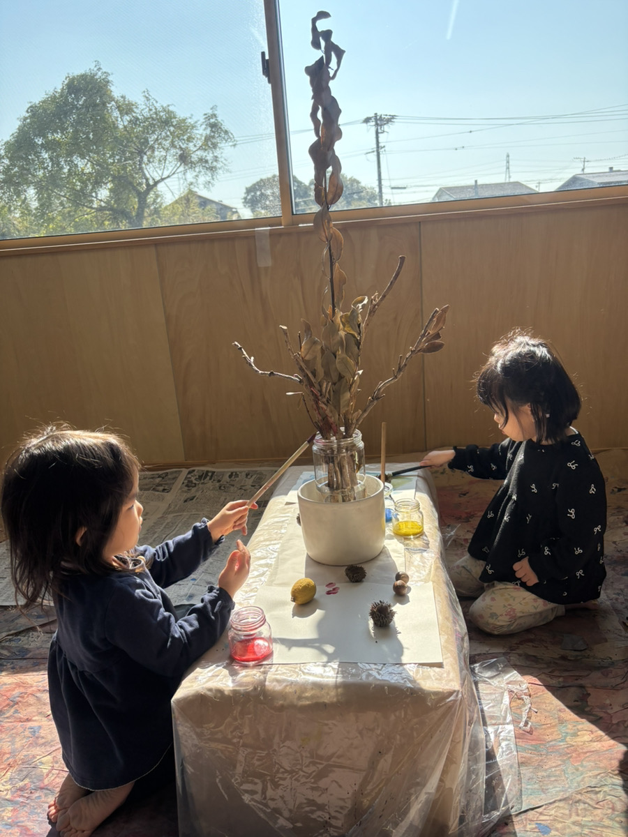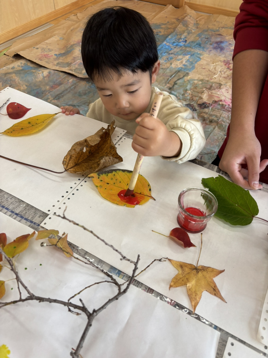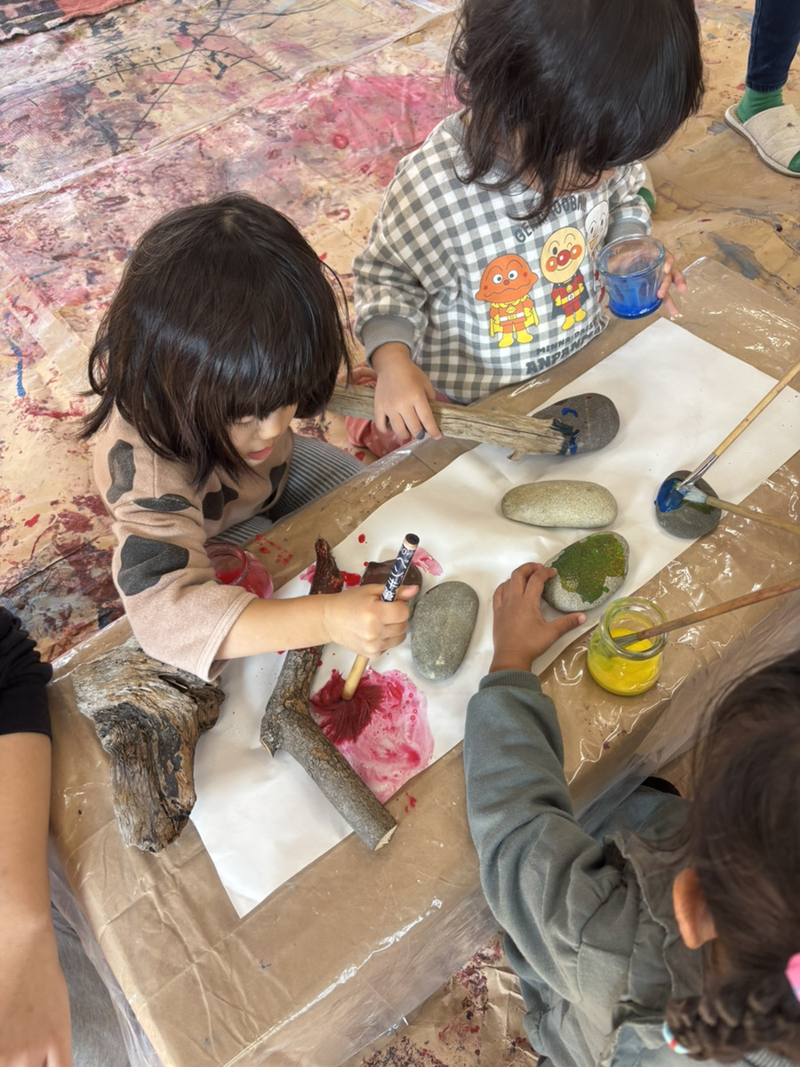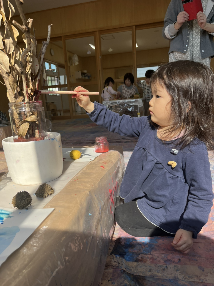 子どもたちは目をキラキラさせながら(躊躇せず!)目の前の季節の自然物を手に取り、絵の具をつかって遊び始めました。熱気のある、でもすごく静かな時間が流れていました。