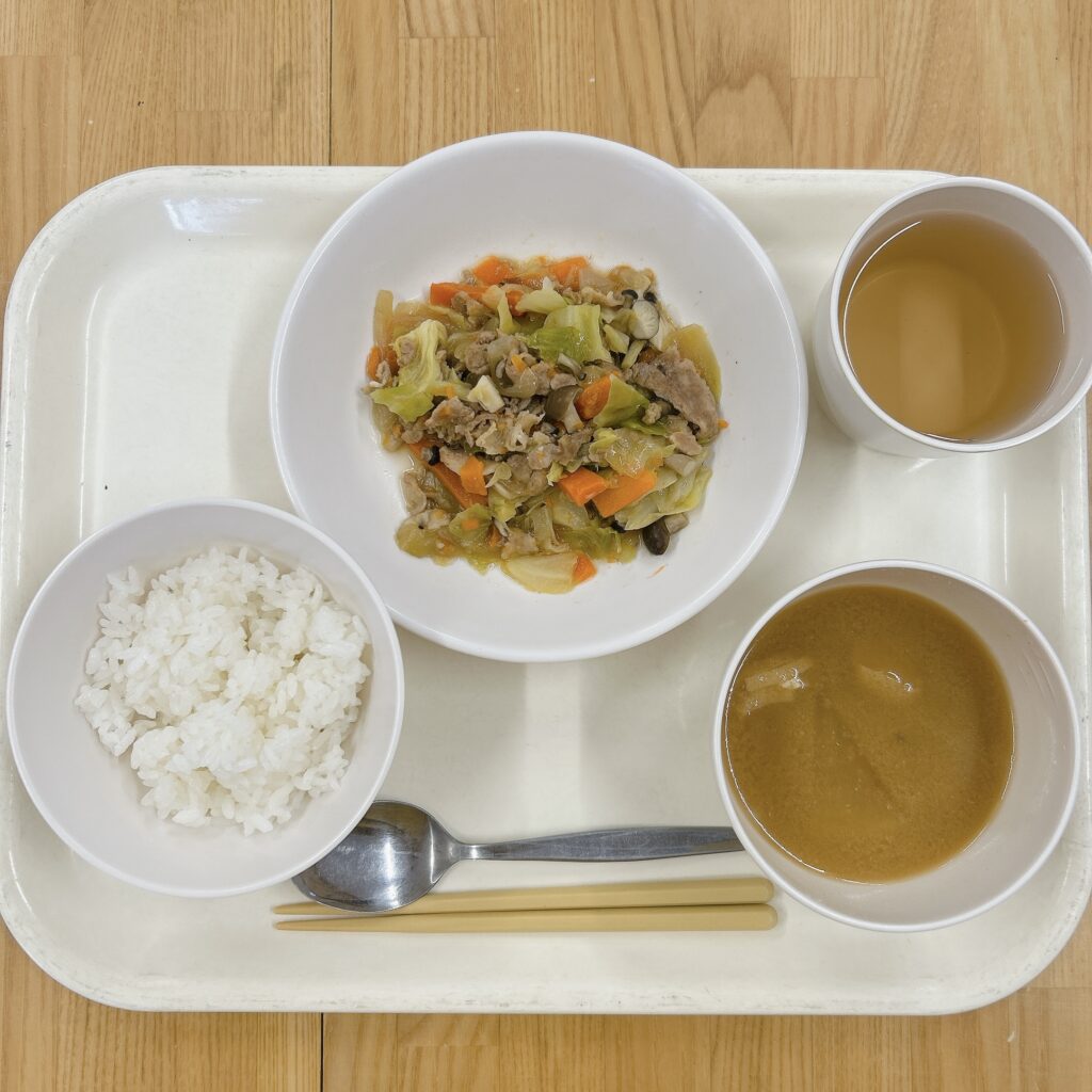 こども園の生姜炒めはたっぷりの野菜と一緒に炒めます。素材の甘みが感じられ子どもたちに人気のメニューです。今日のお味噌汁の具は大根、干し椎茸、油揚げ。寒い日でしたがほっこりあたたまりました。