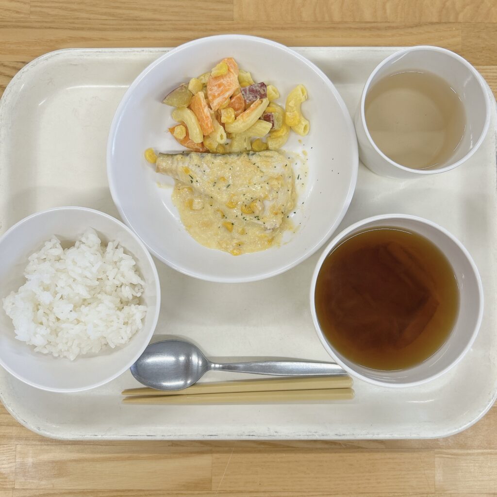 10月14日 (火) ごはん 魚のマヨコーン焼き マカロニサラダ すまし汁 マカロニサラダ (4人分) マカロニ50g 人参45g(いちょう) さつまいも120g(角)コーン缶30g マヨドレ大1と少々 塩少々 ①マカロニを表示時間通り茹でる。②さつまいもと人参を柔らかくなるまで茹でる。③マカロニ、さつまいも、人参、コーン缶と調味料を混ぜ合わせる。④味をととのえて完成です。 抹茶蒸しパン 10月10日 (金) 前の記事 10月14日(火) 次の記事