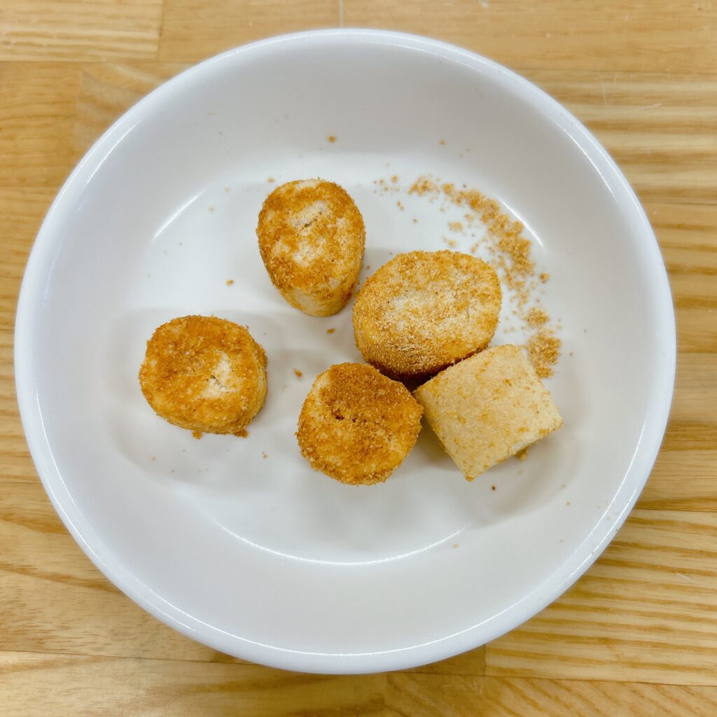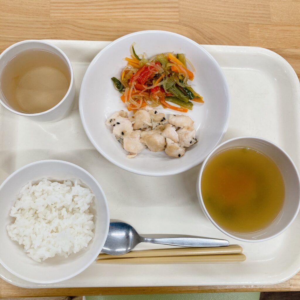 10月22日 (水) ごはん ささみのゴマからあげ 春雨サラダ コンソメスープ ささみは加熱するとパサパサしやすいですが、少量の塩と酒を揉み込み、マヨドレを加え10分ほど漬け味をつけて焼きました。パサつきが抑えられ柔らかくジューシーになるので今日のささみのからあげは人気でたくさんおかわり!という声が聞こえてきました。 麩ラスク 10月21日(火) 前の記事 10月22日 次の記事