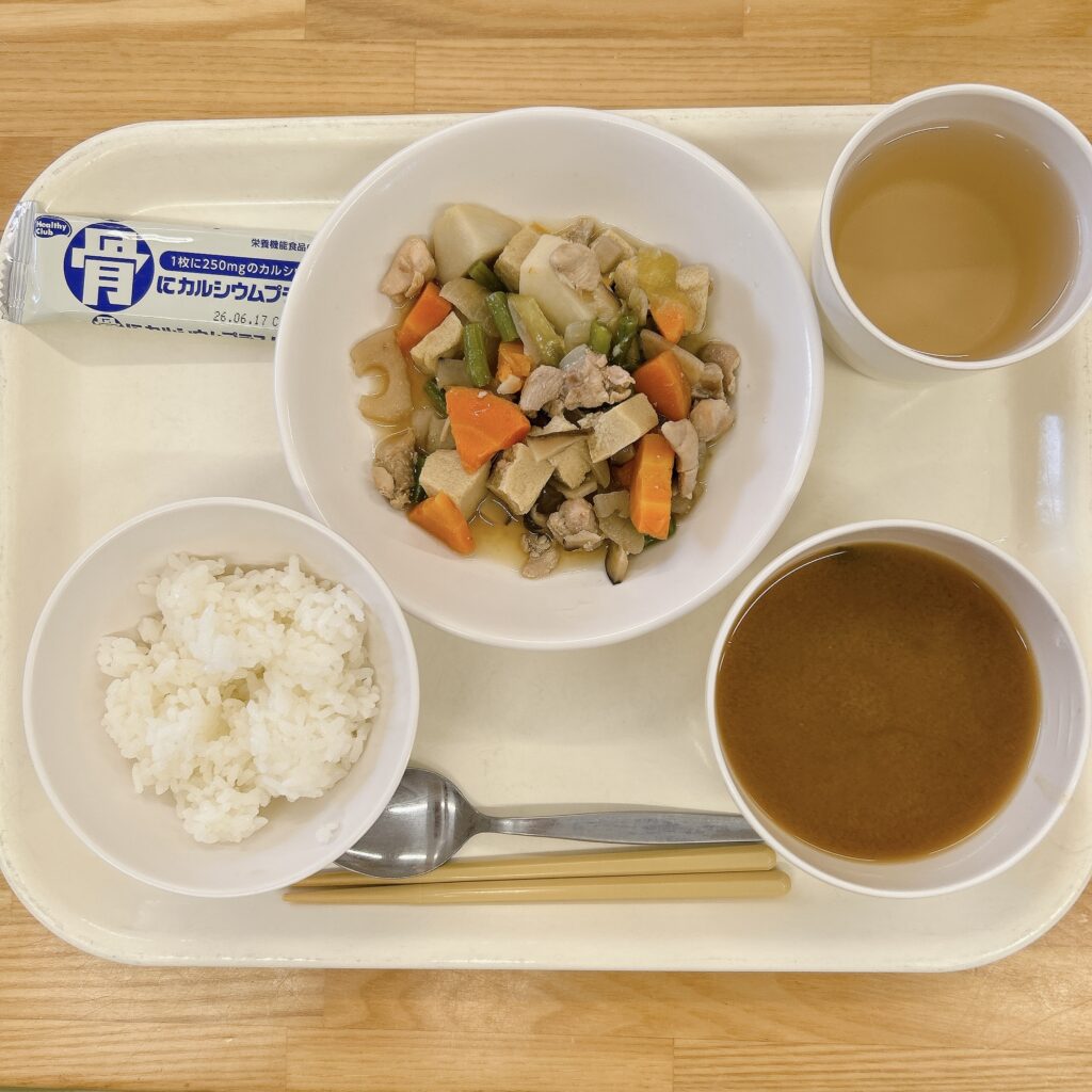 10月30日 (木) ごはん 高野豆腐と秋野菜の煮物 みそ汁 高野豆腐とは、生の豆腐を凍らせて低温で熟成させ、水分を抜いて乾燥させた物で、別名凍り豆腐とも呼ばれています。豆腐を乾燥させることでカルシウムや鉄分などの栄養が凝縮されています。 ブルーベリーヨーグルト 10月29日(水) 前の記事 10月30日(木) 次の記事