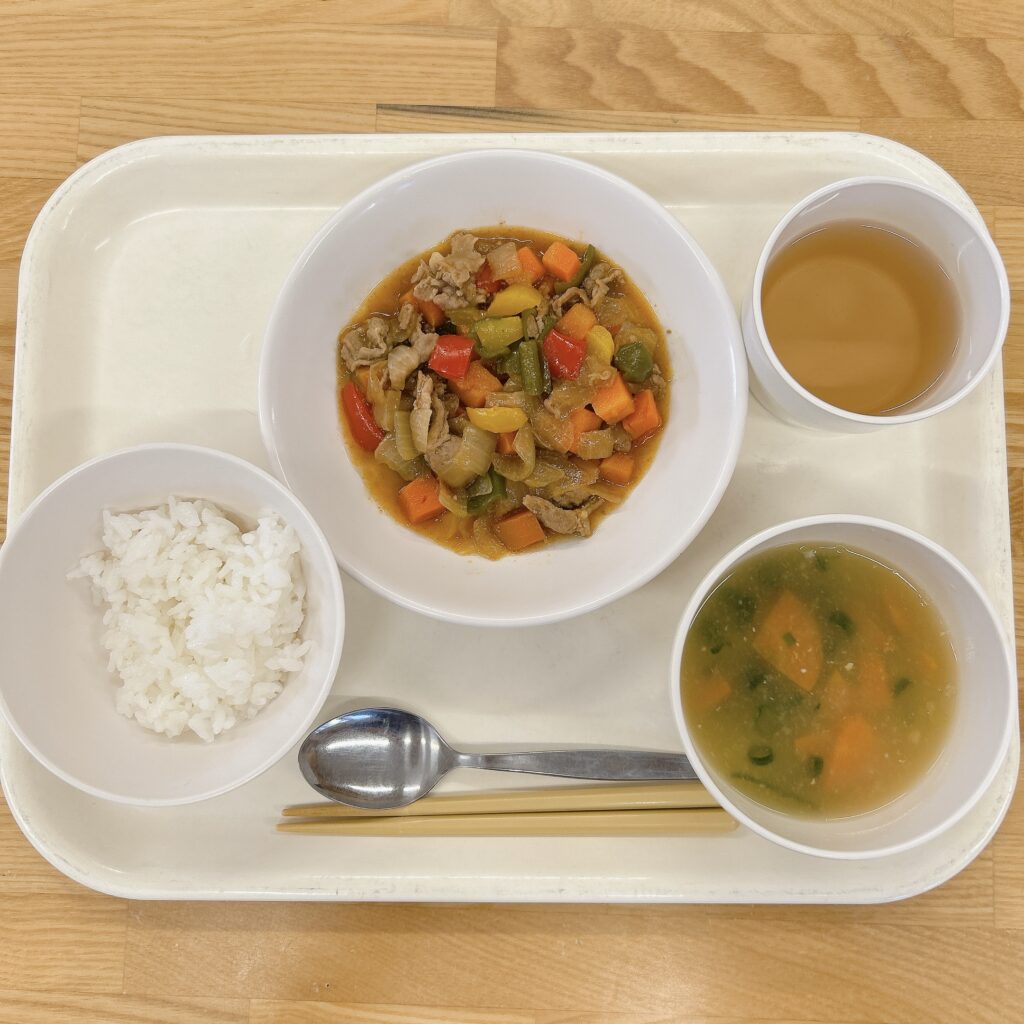①肉→人参、玉ねぎ→パプリカ、ピーマンの順で炒める。②調味料で味をつける。③水溶き片栗粉でとろみをつける。④味をととのえて完成です。