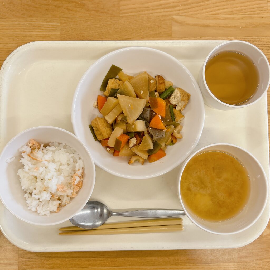 12月3日 (水) 鮭ごはん おでん みそ汁 今日のみそ汁は、おでんの具材の昆布の出汁と鰹節の2種類の出汁で作りました。鰹と昆布の2種類組み合わせることでうま味が強くなる相乗効果がうまれます。「いい匂いがする〜」「はやく食べたい!」「すーぷ美味しかったよ」と教えたくれました! チーズ蒸しパン 12月2日 (火) 前の記事 12月3日(水) 次の記事