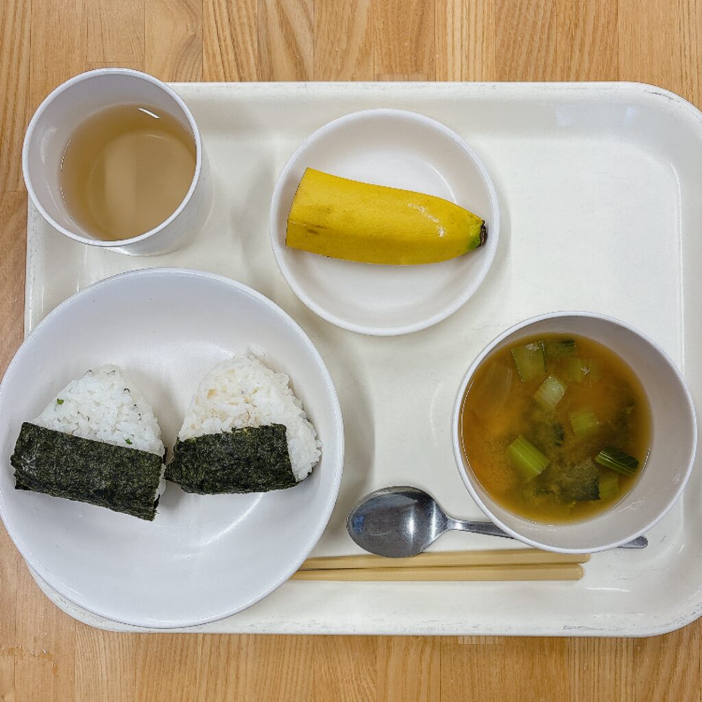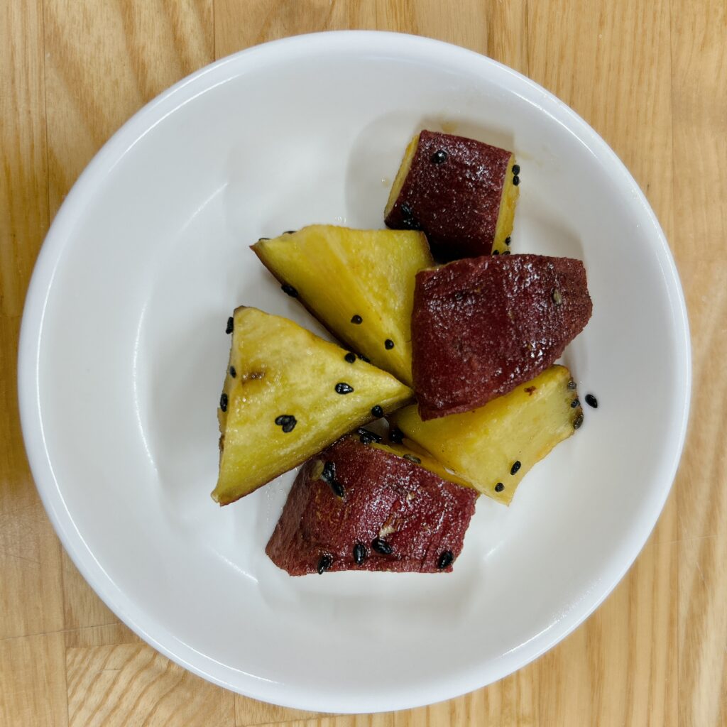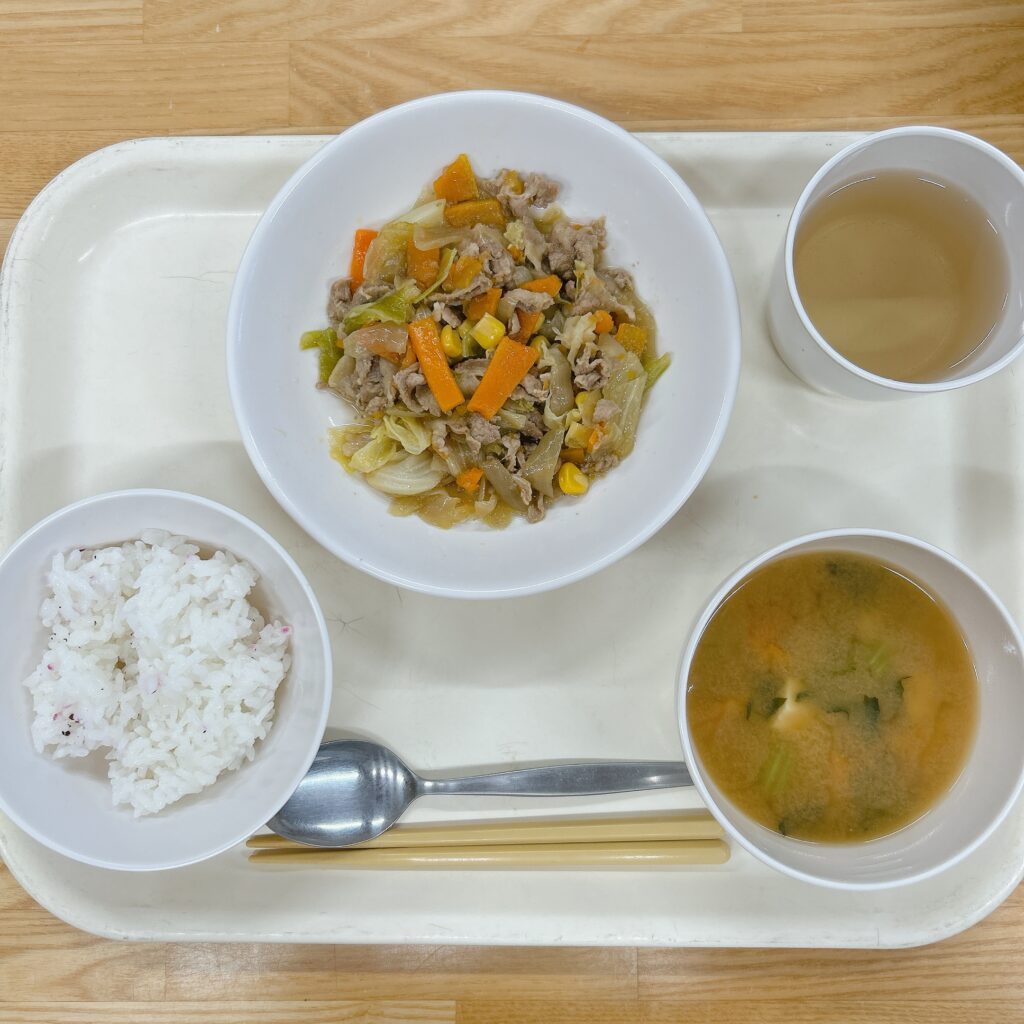 今日の豚汁には、鰹出汁、小松菜、木綿豆腐、豚肉、人参、玉ねぎが入りました。好き嫌いすることなく緑のお野菜もしっかりと食べてくれていました。ゆかりご飯もおいしい〜と言って沢山食べてくれました。おやつの大学芋が大人気でレシピを教えて〜の声がたくさんありました。