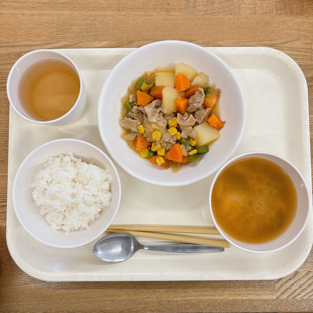 今日はどのクラスも食缶が空っぽになって返ってきました。肉じゃがは、たんぱく質・炭水化物・ビタミン・ミネラルがバランスよく摂れる料理です。人参や玉ねぎの食物繊維で腸内環境も整います。合わせみそ汁は、鰹節から出汁をとり木綿豆腐、人参、玉ねぎ、葉ネギなどが入っており栄養満点です。